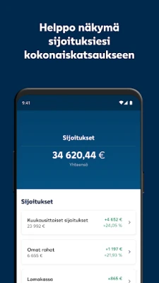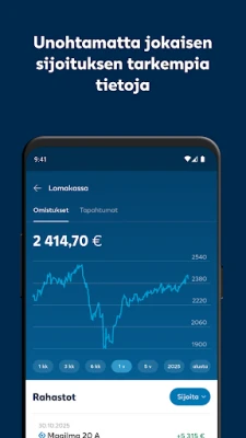 LähiTapiola Sijoitukset -sovelluksen intuitiivisen käyttöliittymän kautta saat välittömän pääsyn kaikkiin olennaisiin sijoitustietoihin. Tarkastele salkkusi kokonaisarvoa, seuraa yksittäisten sijoituskohteidesi tuottoa ja arvonkehitystä selkeiden graafien ja reaaliaikaisten lukujen avulla. Ymmärrä paremmin varallisuutesi rakennetta ja jakaumaa, mikä mahdollistaa tietoon perustuvan päätöksenteon ja auttaa sinua hallitsemaan sijoituksiasi tehokkaammin. Sovellus tuo avoimuutta ja kontrollia taloudelliseen tulevaisuuteesi.