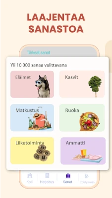 Oppimispolkusi on räätälöity tarpeidesi mukaan älykkään tekoälyn avulla, joka hyödyntää jaksotettua toistoa sanojen ja fraasien syvään ja kestävään muistiin juurruttamiseksi. **Espanja - Suomi sovellus** tarjoaa värikkäitä muistikortteja, yksityiskohtaisia selityksiä sekä korkealaatuisia kuva- ja äänimateriaaleja, jotka herättävät sanaston eloon. Voit aloittaa nollasta tai hypätä suoraan edistyneemmille B2-C1-tasoille – kaikki on 100 % maksutonta, ilman piilotettuja rajoituksia tai ostoja. Sovellus kattaa niin matkailun, liike-elämän kuin seurustelun tarpeet mukautettujen sanalistasovellusten ansiosta.