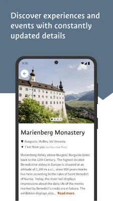 Virallinen matkasovellus kutsuu sinut tutustumaan Etelä-Tirolin henkeäsalpaavaan kauneuteen. Se on täydellinen kumppanisi tämän ainutlaatuisen alueen tutkimiseen, unohtumattomien elämysten löytämiseen ja matkan suunnitteluun.